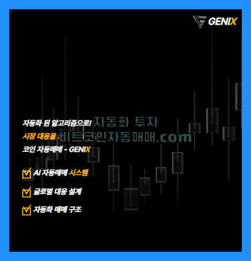 지닉스 스마트 자동매매 GENIX는 기존 알봇 ALBOT을 전면 리뉴얼하여 탄생한 AI 기반 코인 업비트 플랫폼입니다. 지닉스 스마트 자동매매는 안정적인 수익을 내는 것을 목표로 하고 있으며, 현재 글로벌 코인 업비트 솔루션으로 운영중입니다.